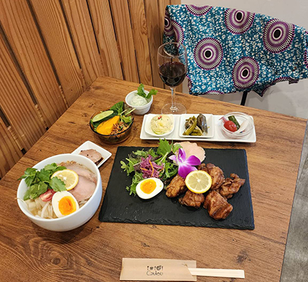 多国籍料理店のイメージを覆すカフェ風のおしゃれな空間に、ドライフラワーや「御崎ガラス舎」に作ってもらったペンダントライトなど、店主の“好き”を散りばめた、こだわりのインテリアが魅力的