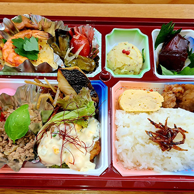どれも野菜中心の手作りおかず4品とサラダ、本日のお茶が付いてボリューム満点