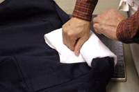 管理された低湿度の仕上場で、保管中の型崩れや着用によるしわ、雨や湿気による縮み具合を専用の仕上台と道具を駆使し「仕立てあがりの風合い」を目標に仕上げます。 |